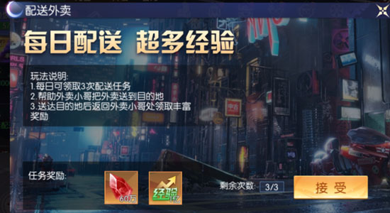 这还是在没有任何加成的情况下,如果购买双倍经验卡玩家升的等级会更高。另外外卖配送也是一个十分休闲,且会赠送大量经验的一个任务。玩家可以通过配送外卖来赚取大量的经验,并且这个外卖配送是没有任何门槛的。玩家只需要轻轻一点,人物自动寻路,然后就会完成任务。此外旅团舞会,趣味答题,家园等任务,都会赠送大量的经验。