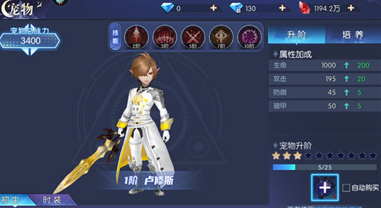 像卢卡斯刚刚开始的话,我们升阶用到初级的宠物能量星球就可以了,每使用一个星球,该宠物将得到十点的宠物升级经验,第一次升级只需要二十五的升级经验,等级越高需要的经验也会相对的提升,经验条上面的星星数量代表着宠物升阶的等级,卢卡斯十个星星都亮起就可以升级到下一个阶段了。