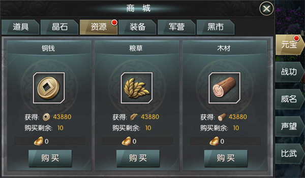 通过打国战获得的战功可以来战功商店这里兑换武器、装备、坐骑等,提升自己武将的战力