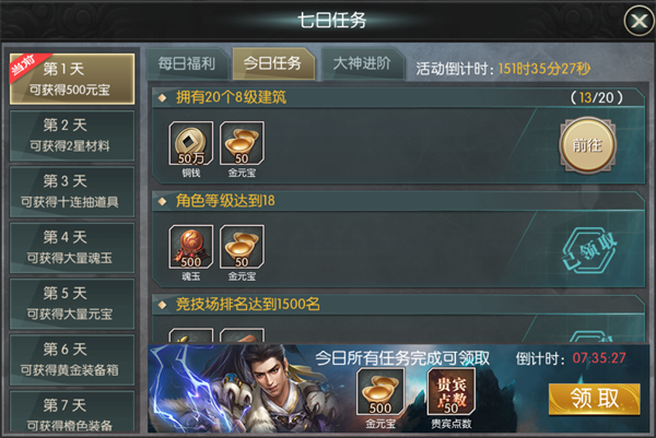 新玩家上线的七天内都可以尽量完成限时任务,这样可以领取更多的奖励,白嫖到更多的礼品!