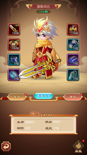 主角可以穿戴八件装备,宠物可穿戴四件装备。主角可以更换皮肤,穿戴皮肤会改变主角形象,激活的所有的皮肤的属性会叠加到主角战斗力中。