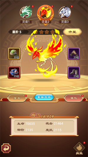 宠物可以消耗金币和兽骨进行升星,每五级可升星一次,升星可以大幅提升宠物战斗力。