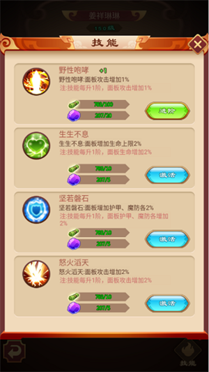 主角和每只宠物都是四个技能,技能是直接增加面板属性。