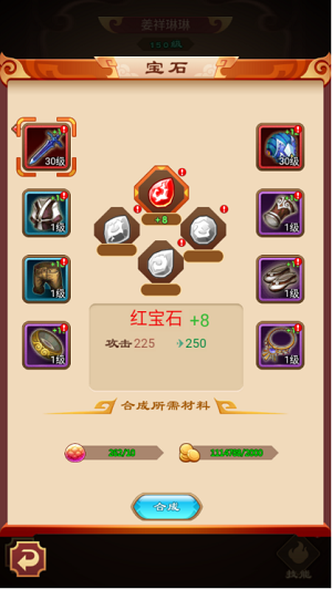 宝石功能15级开放,红宝石加攻击,绿宝石加魔抗,蓝宝石加物防,黄宝石加生命。大家可以按需合成升级