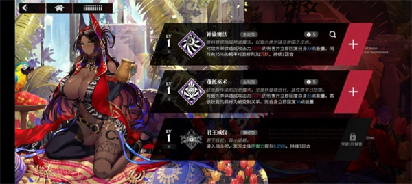 觉醒Lv.1:技能【君王威仪】战斗开始时,我方全体额外获得攻击力提升,饰品【胡狼尾饰】觉醒等级提升。