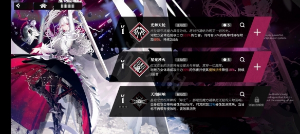 技能效果(Lv.1):对敌方单体造成攻击力【133%】的伤害并立即回复自身33点能量,同时有【75%】的概率对目标附加沉默,持续1回合。