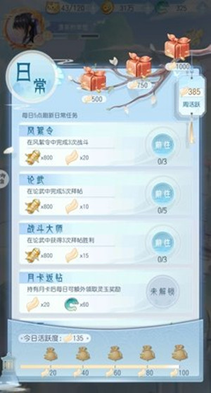 在日常任务中,只要我们完成风絮令、论武、战斗大师等相应任务,就能领取各式奖励,且活跃度达到相应要求,还能额外领取丰厚奖励。