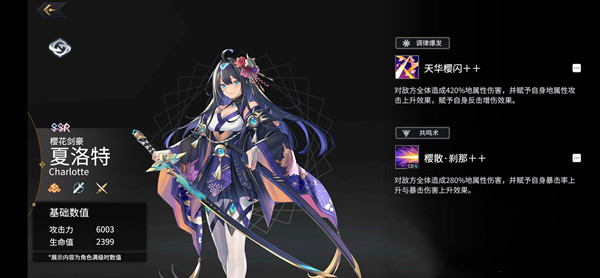 夏洛特:前两个推荐的角色都是两个辅助,而夏洛特作为樱花剑豪,他的天华樱花闪对敌方全体造成伤害的同时,还会附加攻击效果提升,自身还会有反伤的效果,二技能共鸣技能也是对敌方全体造成伤害,并且增加暴击率和暴击伤害,第三个技能无明两段虽然是对敌方单体造成伤害,但是伤害巨高还具有斩杀效果,最好的现象就是初始首抽夏洛特和其他另外一个ssr,如果好好培养的话,夏洛特是前期推图必备的一个。