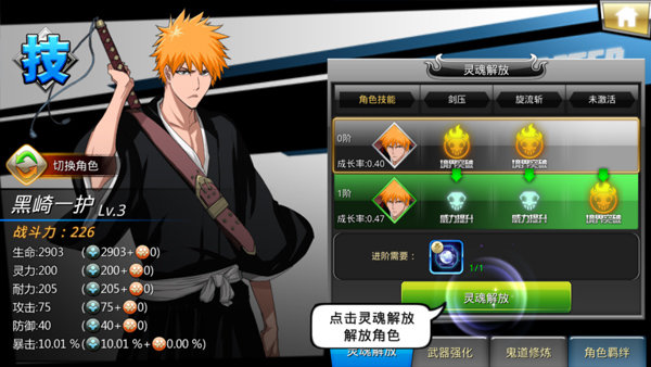 角色灵魂解放不仅能够增强角色基本属性值提高角色成长率还能使角色技能得到进化变得更强,而角色灵魂解放需要足够的角色碎片和对应等级的崩玉碎片。