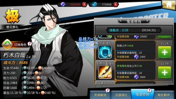 同样的资源,不同的分配方式能带来截然不同的效果。灵魂解放中提升效果比较明显的是5阶升至6阶,角色会得到大幅度提升。资源有限的前提下,优先把主力角色灵魂解放至6阶会有不错的效果。武器强化的等级是和鬼道修炼是紧密相连的,优先将武器强化至可以激活全体鬼道加成的等级能使角色整体水平得到提高,例如“朽木露琪亚”的鬼道中,武器等级为30级可激活“全体耐力强化”鬼道,而“茶渡泰虎”却需要武器等级40级才能激活“全体防御强化”,若强化的资源有限,则优先激活“朽木露琪亚”的鬼道会带来更好的团队加成效果。