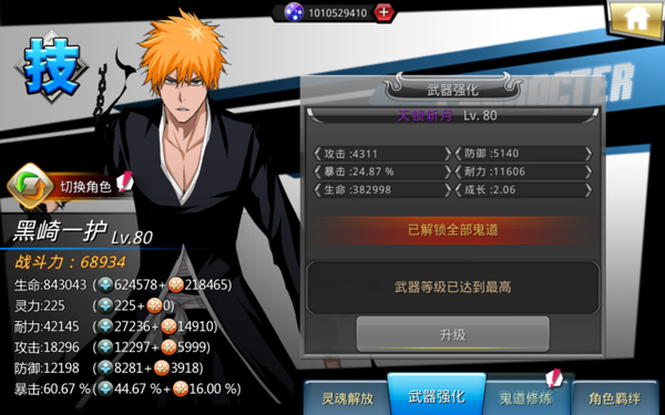 每逢10级的武器强化会需要特殊的突破道具,前期武器强化需要浅打之灵和部分灵子,通过成就奖励和平时通关所得的材料能够轻松完成强化,而后期的武器强化则需要角色对应的武器之灵,例如“黑崎一护”武器突破需要“斩月之灵”。 许多角色的武器之灵可以在其对应的精英关卡通关奖励中获得,各商店也会随机出售,所以平时在商店中遇到了千万不要错过。武器强化时灵子不够怎么办?别忘记了番队的助战功能,还有每日的地狱蝶活动,灵魂试炼闯关等,这些都是能够获得海量灵子的地方。