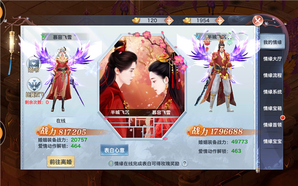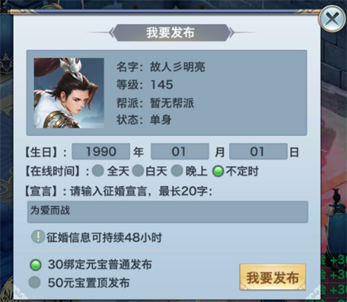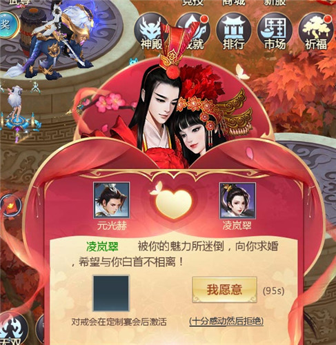 在玩家情缘大厅,发布自己的征婚宣言,浏览其他发布宣言的玩家们。关注,送花,私聊一气呵成,直至亲密度达到520时,“你愿意嫁给我吗?”。