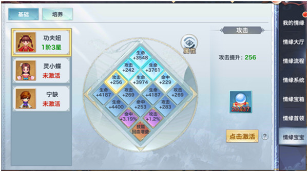 情缘宝宝:婚戒达到10级后解锁,培养界面可以有针对性地培养宝宝的属性。不同宝宝的培养加成各不相同,选择也会有所差异。功夫妞是平衡型,灵小蝶是防御型,宁缺是攻击型。