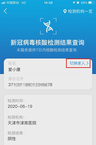 完成后回到核酸检测结果查询页面,点击“切换家人”,选择添加后的家人即可展示家人的核酸检测信息。