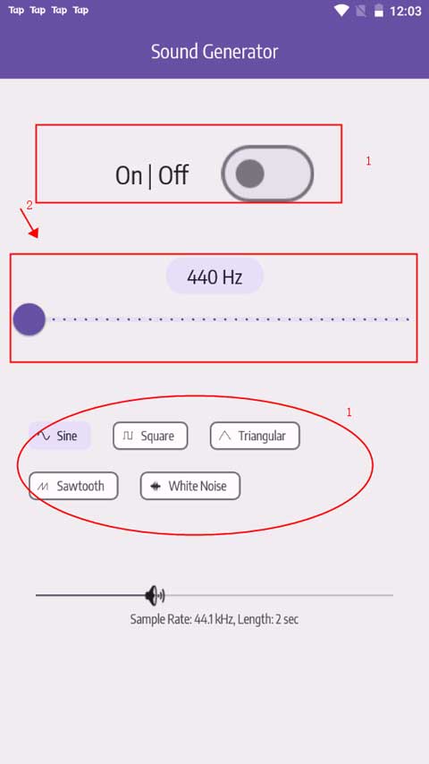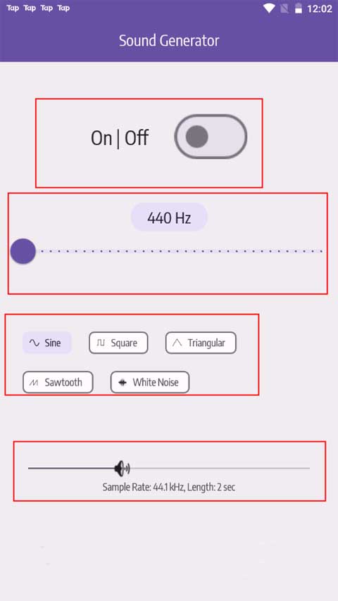 小编首先为用户们讲解一下该应用的功能区域及其作用,它主要划分为四个部分:开关按钮、频率调节、波形类型和采样率。