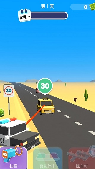 玩法方面,以公路上的超速测速为背景,借助仪器对往来的各种车辆进行测速,当遇到超速的车辆后,需要对其进行拦截并作出相应的惩罚,游戏将通过玩家的惩罚方式给出相关的奖励,用于提升自己的装备,更好的服务大众。