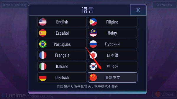 1、在本站下载并安装游戏,打开进入游戏如下图,点击右下角“language”,