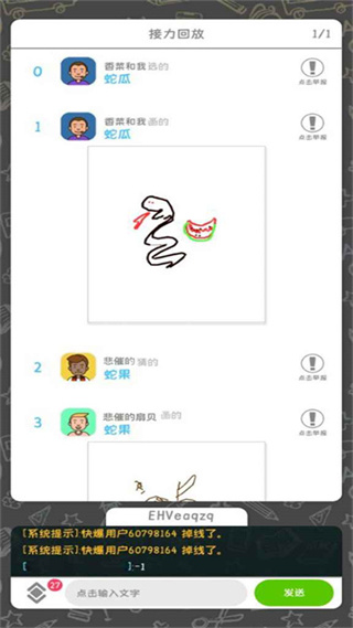 ,游戏的玩法就是你画我猜,而在这个基础上又加了一些因素。有猜画的还有画画的,画画的人画的方式不只是一个人画其他人猜,而是画画接龙的方式画下去,然后要猜画的人则要猜出他们接力画的画,不过题目或许和你想象的不一样,因为你面前会出现一些各种诡异的画面,而这些画面都是由其他的玩家手绘出来的,而你现在要做得就是通过自己的脑洞,来猜出其他玩家的想要表达的意图,非常有意思。