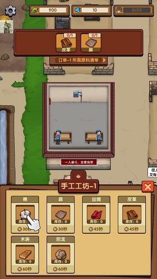 3、根据前期的新手引导,进入工坊,在这里你可以选择产品类型,如图所示,选择完成后,工人们便开始了产品的加工。