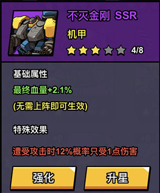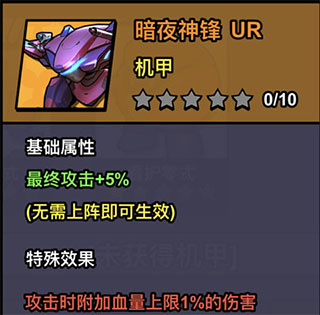 说明:该机甲虽然是SSR机甲,但随着登录天数的累计,装备基础属性加成会越来越高,后期甚至比UR机甲还强,建议优先获得,越早获得收益越大
