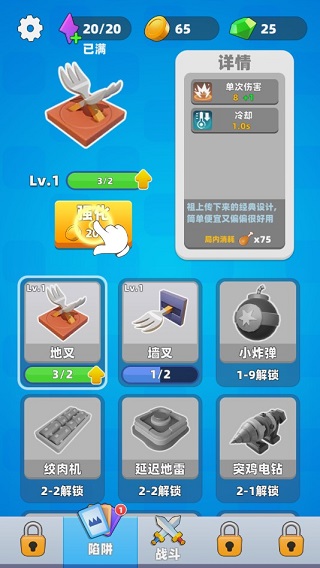 随后,玩家可以通过不断挑战地图来解锁新陷阱。解锁的陷阱可在关卡挑战中部署。在游戏开始前,还可以选择初始增益以获取强力的陷阱效果!