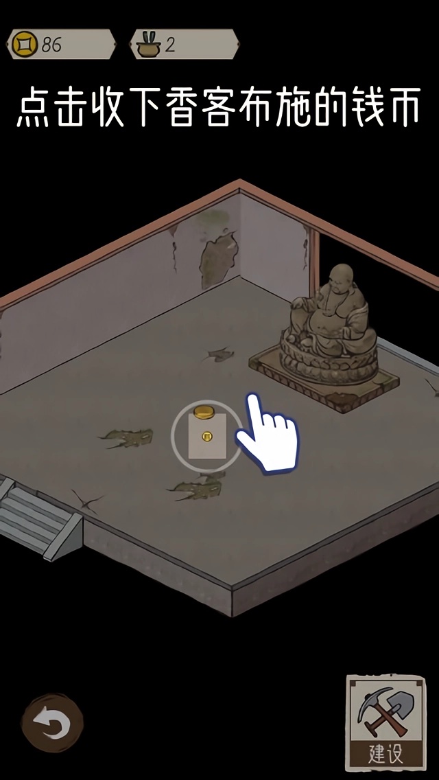 2、耐心等待香客进入天王殿内,面对破烂不堪的天王殿内部,可以点击【建设】按钮来改善天王殿的环境。