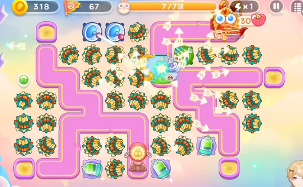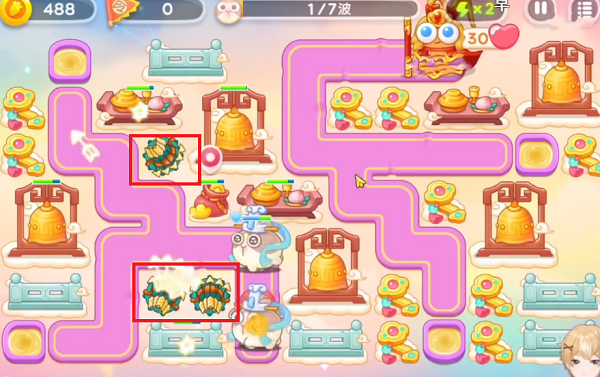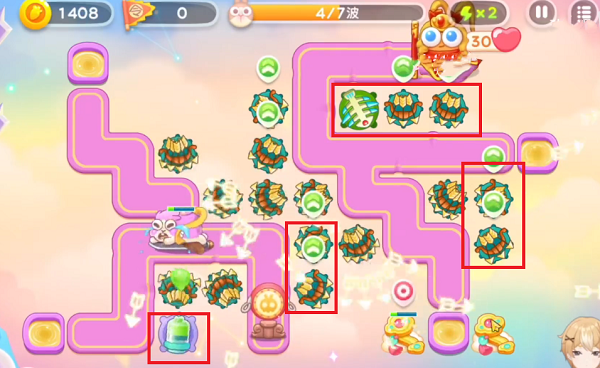 1、开局造两个弓箭升满级,下方打掉道具后加弓箭,也升到满级,解决完第一波全部粉兔后,锁定钱袋。