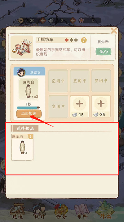 14、进入手摇纺车制作商品界面,在下方选择物品后,选择【点击加速】可以帮助我们更快地制作商品,