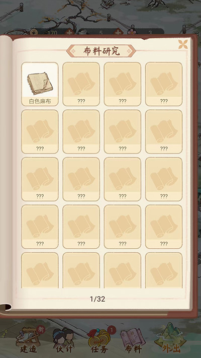 4、进入胡记布庄游戏主界面,包括【建造】、【伙计】、【任务】、【布料】和【外出】等游戏设定,点击【建造】选项,