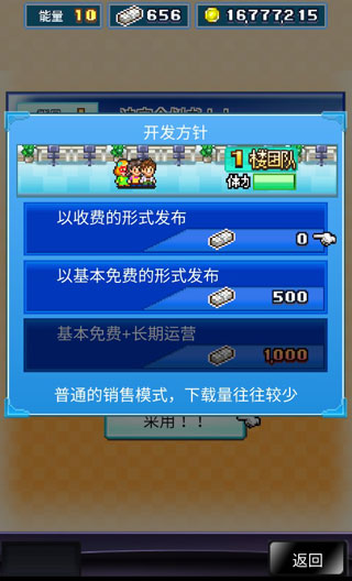 游戏的玩法很简单,就是一个社长带领自己的员工去研发游戏,想尽一切办法去提升游戏下载量。研发——选择平台——制作企划方案——选择游戏类型——确定游戏内容——然后就是员工研发游戏——排除故障——最后完成游戏开发,给游戏起个名字就OK了。