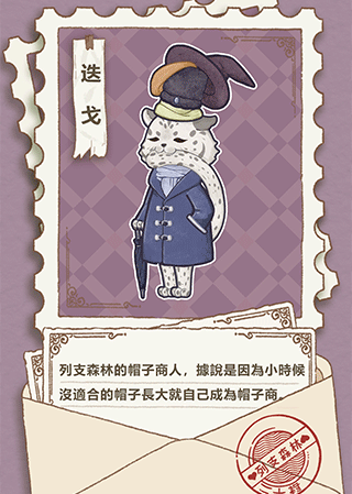 描述:列支森林的帽子商人,据说成为帽子商的主要原因是自己小时候没有合适的帽子。