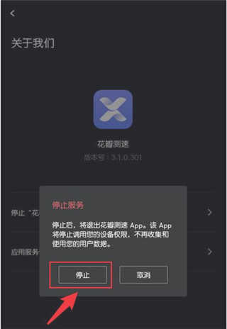 2、在关于我们页面中,点击【停止“花瓣测速”服务】,如图所示