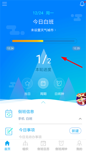1、若是要在倒班助手里面更改班组信息,大家应该先在软件的首页上方选择图标(如下所示),从而进入到倒班详情页面。