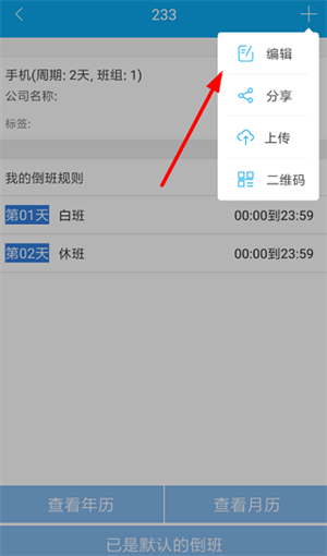 2、接下来从倒班页面的右上角选择“+”功能,点击列表里的“编辑”功能就可以修改当前的班组信息了。