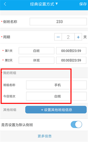 3、随后在页面下方找到“我的班组”选项,这样就可以修改班组的名称和今日班次,通过右上角按钮进行保存。