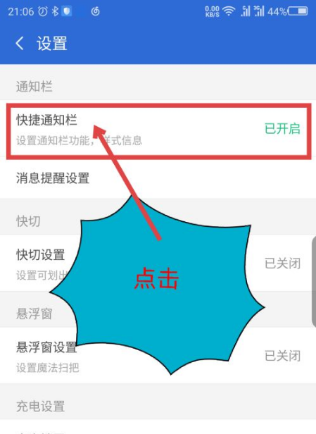 在设置界面,上面一栏就是通知栏设置选项,点击快捷通知栏。