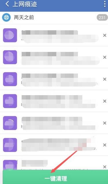 看到上网痕迹之后,接下来我们把鼠标移动到上网痕迹下面的清理选项上面,然后点击清理,紧接着出现一个我们最近的上网痕迹,以及最下面的一键清理。
