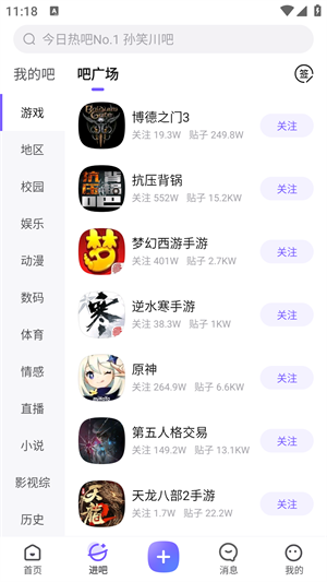 1、点击贴吧界面可以选择关注。