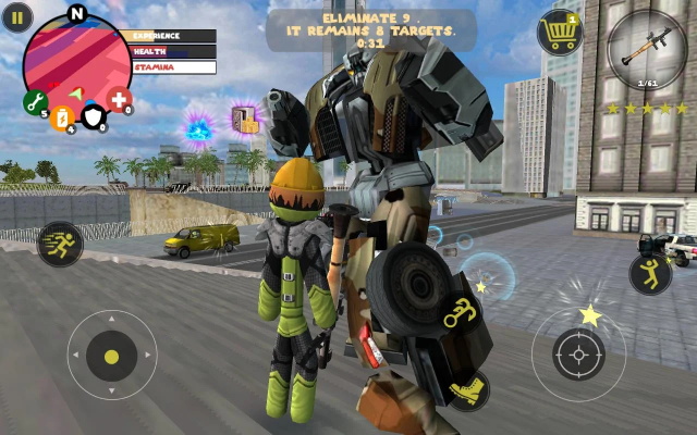 游戏的操作界面设计简洁,左侧为移动和加速按钮,右侧则是绳索、攻击和跳跃按钮。右上角实时显示武器更换、血量和经验等信息。玩家可以通过自由玩法与其他帮派角色交火,击杀敌人获得经验并提升星级。随着星级的提升,警察和其他角色会对玩家展开更猛烈的进攻,玩家需要灵活运用策略和操作技巧才能存活并完成任务。