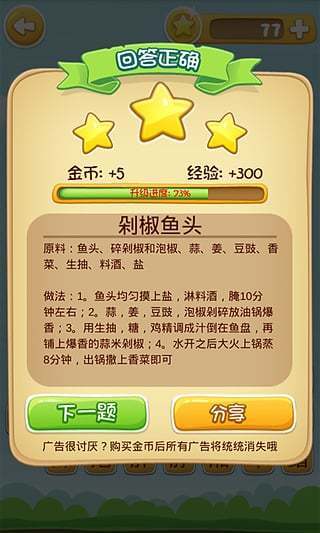 1、白吃?吃货大人?美食家?还是食神?哈哈,来看看你是哪一级吃货?游戏通过丰富的题库和多样的挑战模式,帮助玩家了解自己在美食领域的水平,并逐步提升自己的美食知识。