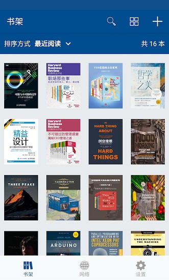 图书书架:myReader允许以「列表」或「网格」的方式展示导入图书的详细信息,用户还可以通过长按图书查看更多的信息,如「标签」和「简介」等,方便用户快速找到所需图书。