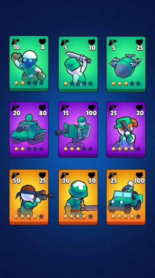 1.游戏中有着内容丰富的火柴人可供玩家选择布阵,每种火柴人的血量和攻击力都各不相同,策略性极强。玩家可以根据不同的战斗需求,选择合适的火柴人进行组合,打造出独一无二的战斗阵容。