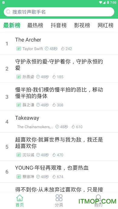 每日更新1000+时下最热门的铃声资源,单曲循环100遍也不嫌多,满足你对流行音乐的追求。