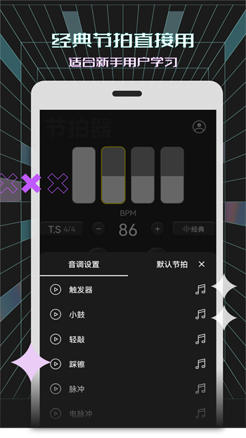 -自主调节各种节奏的音律直至调出所需节拍。用户可以根据自己的需求调节节奏的音律,找到最适合的节拍。