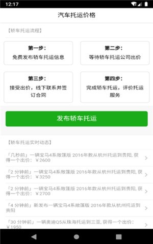 使用《汽车托运价格》非常简单,只需几步即可完成托运流程。第一步:免费发布轿车托运信息;第二步:等待轿车托运公司出价;第三步:接受出价,线下联系并签订合同服务;第四步:完成轿车托运,评价托运服务。软件支持免注册一键发布,用户可以快速获取报价,并与上百家专业的托运公司合作。无论是个人用户还是企业客户,都能通过这款软件轻松完成汽车托运,享受高效便捷的服务体验。