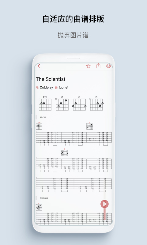 -自适应的曲谱排版,避免图片谱字体小、缩放带来的各种不便,提供更舒适的阅读体验。