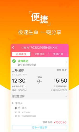 2、国内、国际机票在线提交退改签;用户可以通过app轻松完成机票的退改签操作,节省时间和精力。