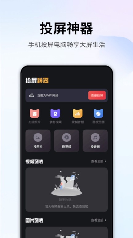 投屏的过程内可以使用音乐,图片,视频来进行画面展示,满足您多样化的投屏需求。