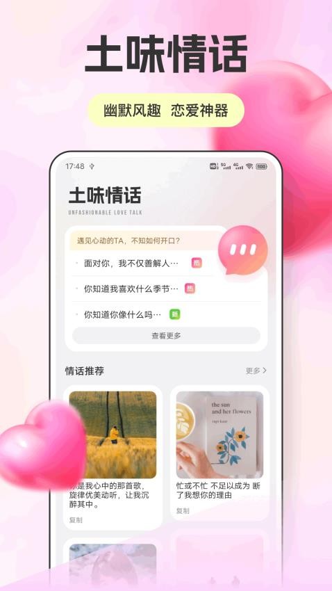 2、在土味情话页面,用户可翻看诸多推荐的情话内容并一键复制使用,轻松提升聊天趣味。情话页面支持收藏功能,方便用户随时回顾和使用。