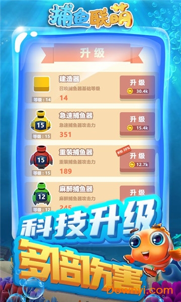 炮台升级系统:消耗金币提升攻击力、射速和渔网范围。